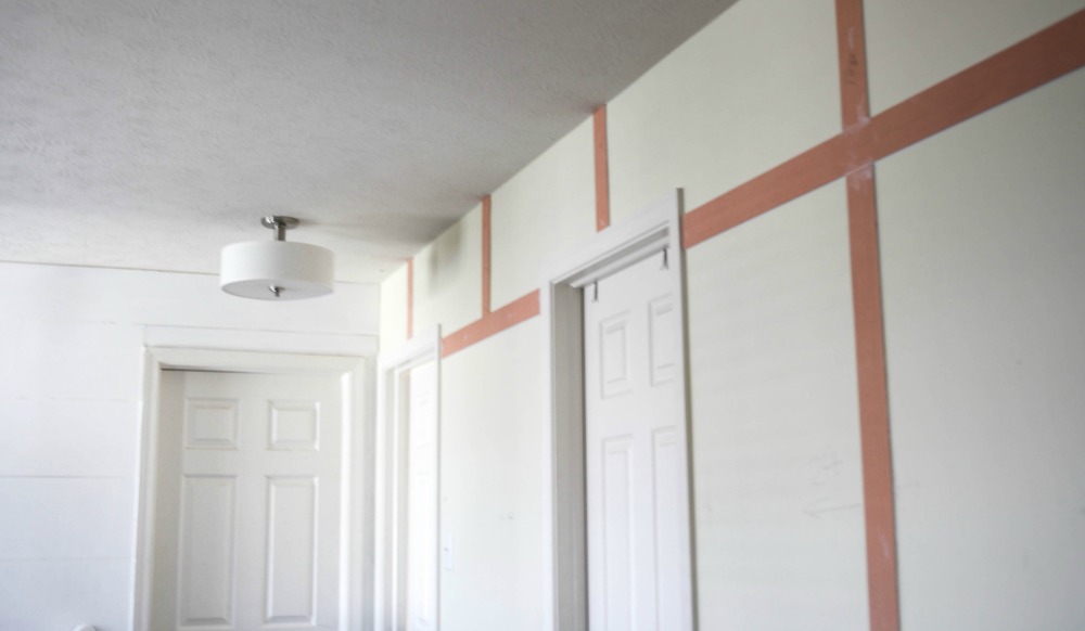 2. Then I played around with a grid pattern by drawing it up on the wall, making sure that each section of 3″ plywood would intersect a stud. ( I wanted to add some large pictures inside each grid, so I needed to make sure they would also work with the pattern.)