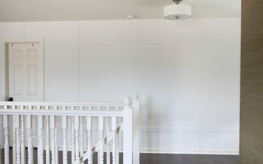 Is there a project that you have been putting off for a while? My upstairs hall was one of “those” projects, and I’m kicking myself that I waited so long! I didn’t want to spend a lot of money on the makeover, so I came up with a wall treatment that cost less than $100 and only took a couple of days for me to complete on my own (if you had someone helping you, this could easily be done in a day!).