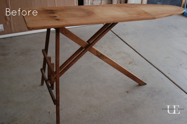 It was a beautiful, old ironing board. I cut off the curved end and made it into a skinny table. Super easy!
