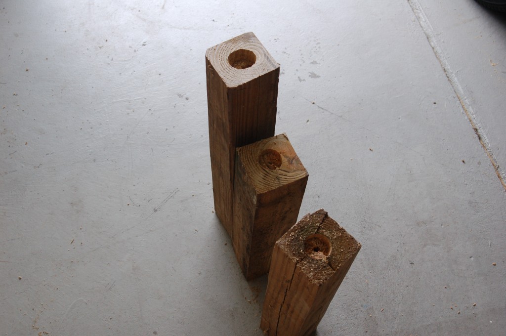 I drilled holes in the top of three posts with a 1 1/2 in. bit to fit tea lights.