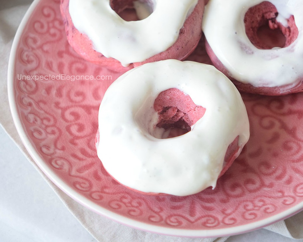 These Red Velvet donuts are so good…especially topped with cream cheese icing!! They are the perfect combo of cake and donut.