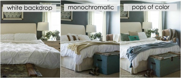 So, I did a little experiment to show you just how easy it is to change the feel of your room when you have white backdrop. (All you need are a few pillows and throw for these quick changes.)