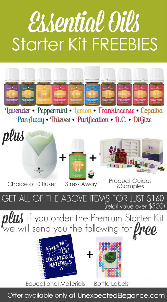 I would strongly recommend starting with the Premium Starter Kit. It’s BY FAR the best value, as it includes 11 oils to try out (frankincense, lavender, peppermint, lemon, Panaway, Purification, Thieves, StressAway, Melaleuca, Citrus Fresh and Joy. It also comes with a really nice home diffuser that is normally priced at $98 just by itself, and the total retail value of the kit is over $300! And, just because I’m nice like that (and because I really believe these oils are life changing), if you sign up here at Unexpected Elegance, I will throw in even more freebies–an essential oils quick reference guide and a set of bottle labels!